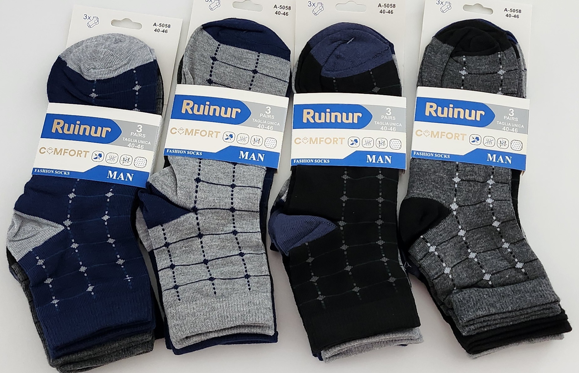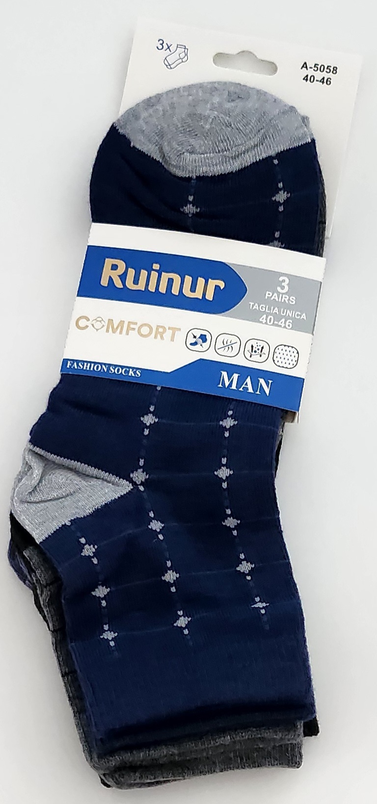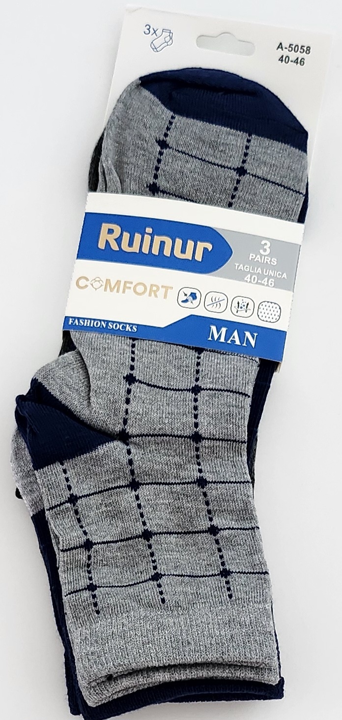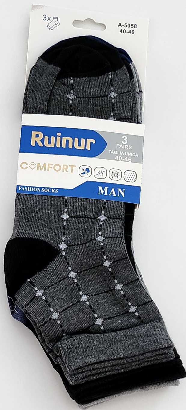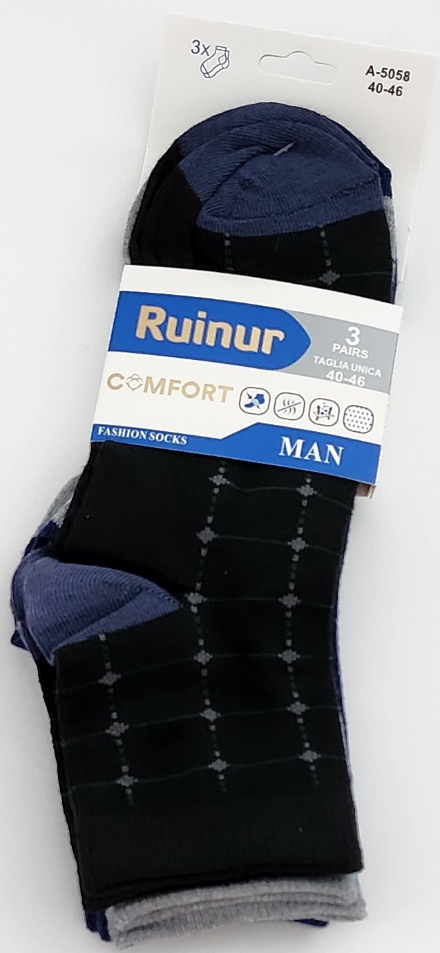 NOGAVICE, 90 % Bombaž, 10 % elastan, Uni 40 – 46 noga, paket 3 pari ( naključne barve, sive, modre, črne ), cena 4,00 EUR / 3 pari.