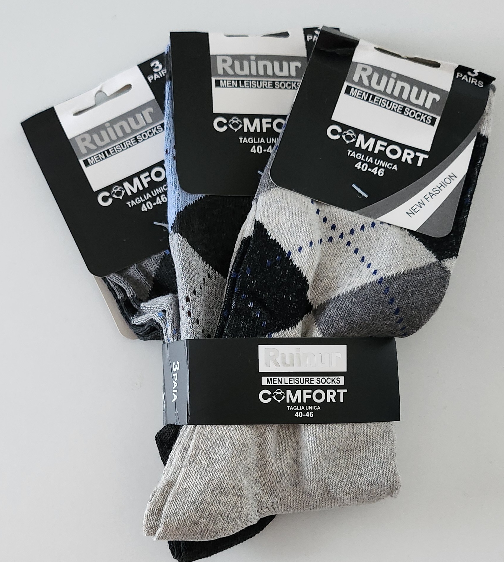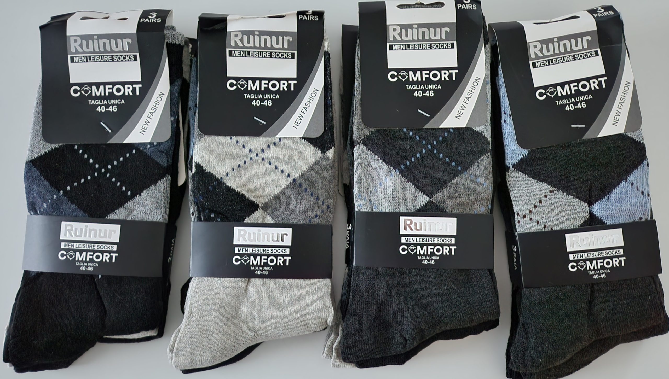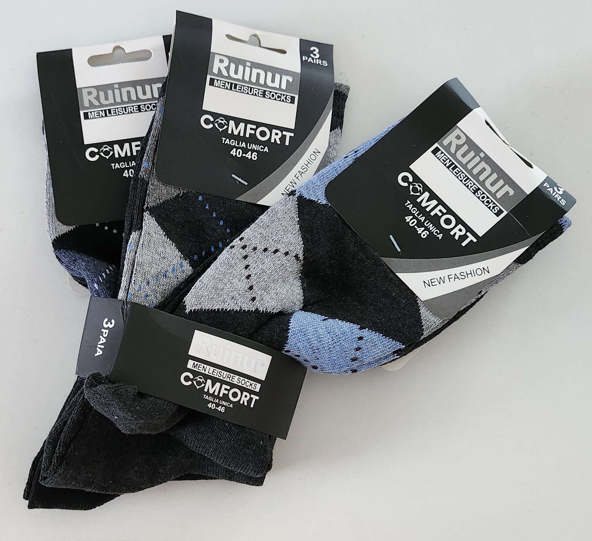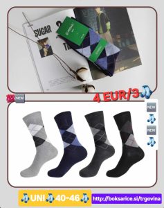 Nogavice, 95 % Bombaž, 5 % Elastan, UNI ( 40 – 46 noga ), 3 pari nogavic v paketu ( sive, modre, črne ) naključne barve, cena 4,00 EUR / 3 pari.