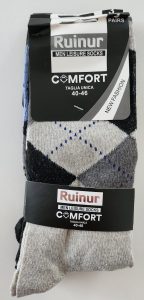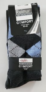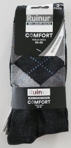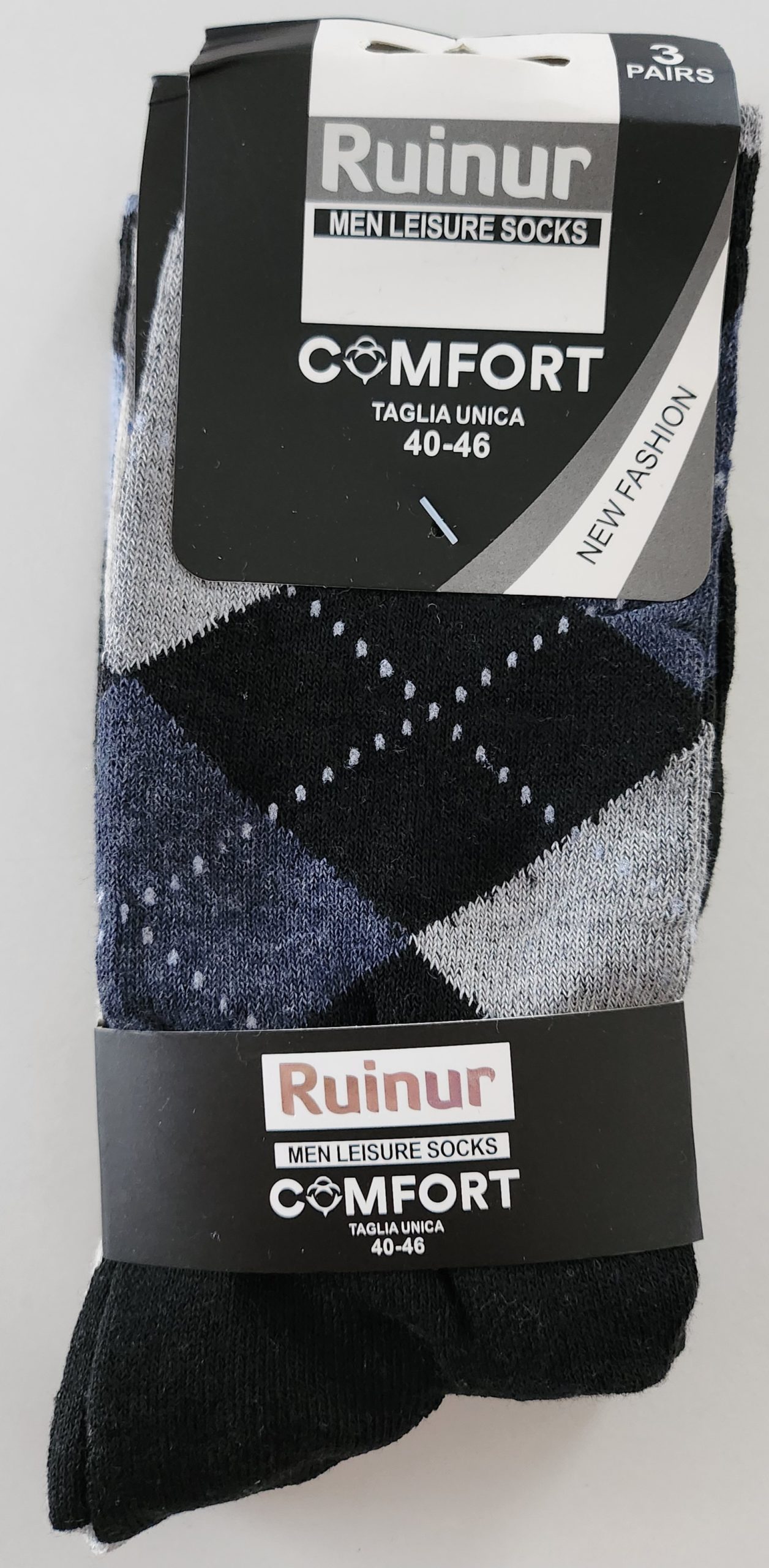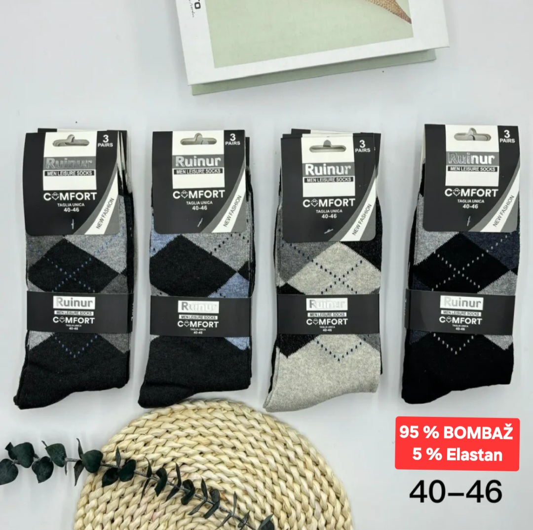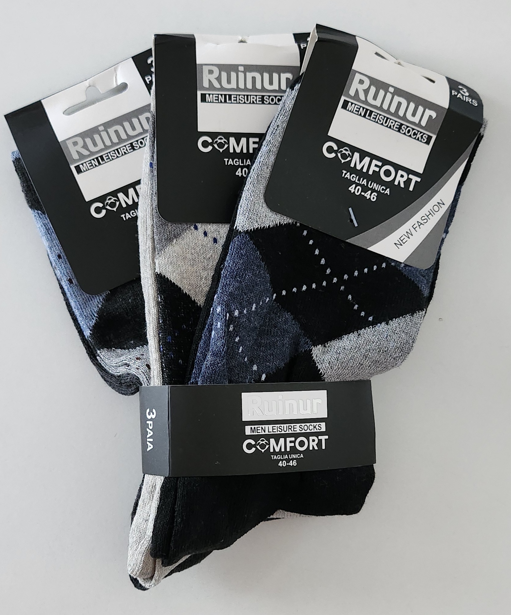 Nogavice, 95 % Bombaž, 5 % Elastan, UNI ( 40 – 46 noga ), 3 pari nogavic v paketu ( sive, modre, črne ) naključne barve, cena 4,00 EUR / 3 pari.