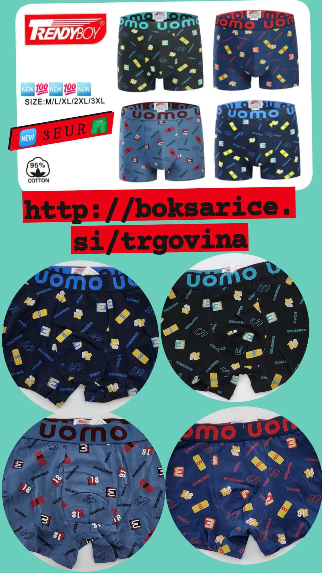 UOMO BOKSARICE, 95 % Bombaž, 5 % Elastan, M, XL,  normalne velikosti. Uomo je priznana blagovna znamka, ki ponuja kvalitetne moške boksarice po zelo ugodni ceni.